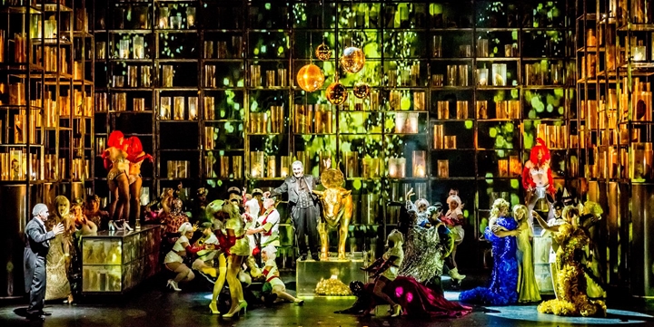 Zu Beginn des ersten Akts schleppt sich Faust mit einer Gehhilfe über die Bühne, am Ende des fünften wird er von Mephisto im Rollstuhl von der Bühne geschoben. Olivia Fuchs ent-faltet ihre Lesart der Oper in strenger Konsequenz. Nur beim Tanz ums Goldene Kalb und in der großen Walzerszene gibt sie, unterstützt von Falk Bauers aberwitzigen Kostümen, dem Affen Zucker und präsentiert ein groteskes, grelles, transvestitisches Panoptikum heutiger Wohlstands- und Partygesellschaft. Den martialischen Chor der Soldaten im dritten Akt verfremdet sie zu einer skurrilen Kriegsveteranenfarce.