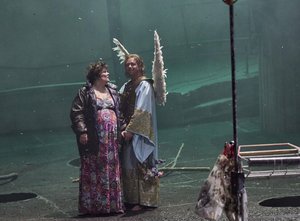 Nicht genug des Blutvergießens, schneidet sich Kundry am Ende des zweiten Aktes auch noch die Zunge ab. Sie hat ja eh nichts mehr zu singen. Im dritten Akt lallt sie nur noch ihr "Dienen". Gemeinsam mit Parsifal sucht sie den erblindeten Gurne-manz auf. Nach passionsspielhaft frömmelnder Fußwaschung und -Abtrocknung mit roter "Verführungsperücke" mummt sie auf einem Einkaufswagen Parsifal als Rauschgoldengel, behängt mit Devotionalien aller Religionen samt Richard-Wagner-Büste.